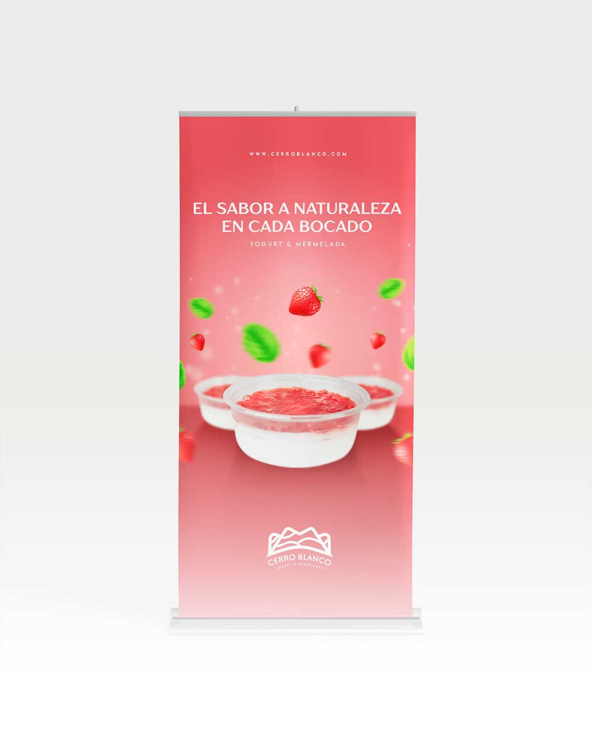 Banner promocional con slogan, Diseño dinámico en rojo intenso con fresas y menta flotantes que resalta la frescura del producto.